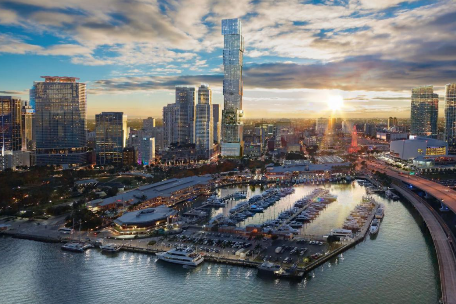 A 1,049 foot, 100-story mixed use tower which will include a Waldorf Astoria Hotel by Hilton is being planning in downtown Miami Florida. The Waldorf will include 360 private residential condo units as well as 205 guestrooms and suites and become Miami’s tallest building which is currently 85 stories. The project is being developed by PMG at a cost of $1 billion. Architects designing the project include: Carlos Ott and Sieger Suarez with the interior design by BAMO. The developer has opened a sales center adjacent to the site with plans the break ground late 2021 or early 2022 contingent upon the pace of sales.