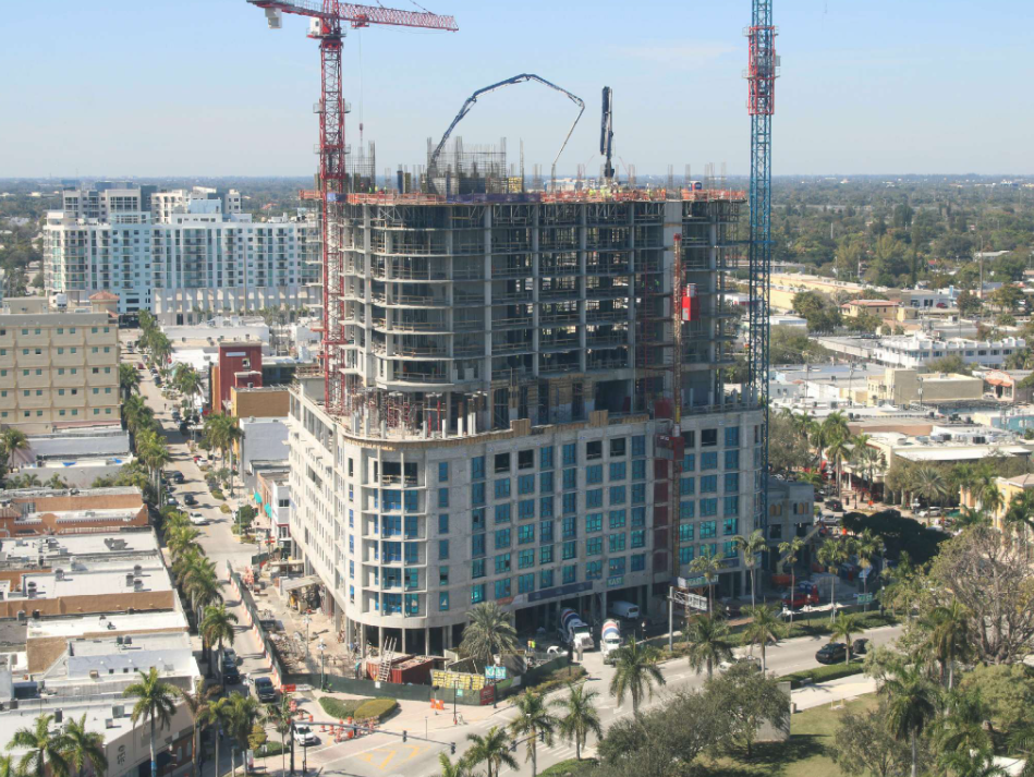 Hollywood Florida’s Block 40 tower continues to rise and is nearly topped off. The building has now reached level 17 of construction, according to a contractor Cavossa Management & Kast Construction. Block 40 will include 166 apartments and a 103-room Hilton Garden Inn in a 19-story tower. It is being built on the site of the Great Southern Hotel at N Young Cir & 1858 Hollywood Blvd. The hotel closed in 1991. A portion of the historic hotel’s interiors and northern and western walls will be integrated into the new project. GCF Development and Chip Abele of Florida Gold Coast are the project developers. Adache Group is the architect. International Design Concepts is the interior designer. The project will be completed in January 2022 at a cost of $90 million.