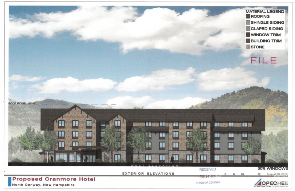 Developer CMR Properties and Lafrance Hospitality are proposing to build the Marriott branded Cranmore Mountain Resort in North Conway, New Hampshire. The project is currently in site planning and subdivision review to demolish the Cranmore Fitness Center and construct a four-story, 90-room hotel at 165 Skimobile Road. Josh McAllister of HEB Engineers is preforming the site design and engineering. The proposed hotel would be located in the Recreation Resort District on the site of the current Artist Falls Lodge, which until recently was home to Cranmore Fitness and would be considered a supporting use to the Cranmore ski resort.