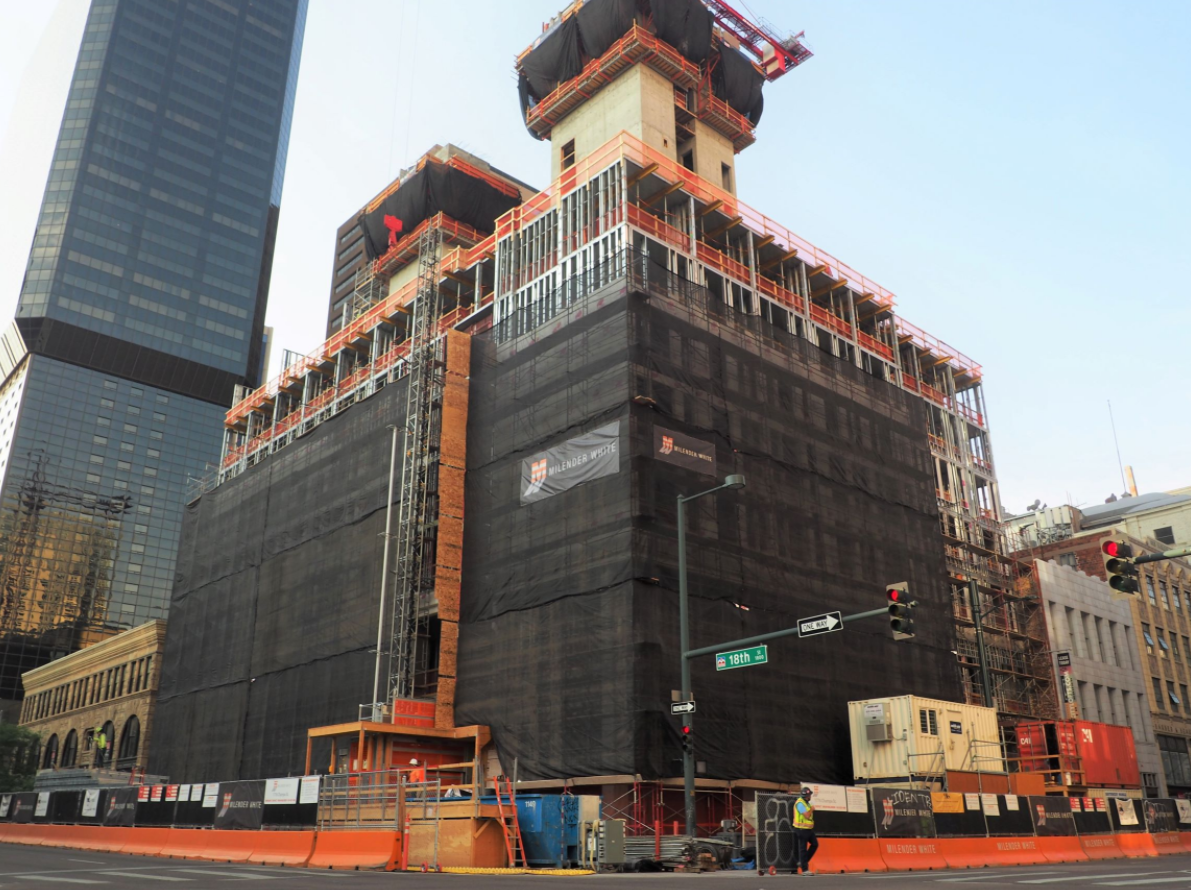 The Hyatt Centric under construction at the corner of Champa and 18th streets in downtown Denver Colorado is making progress. Construction began late last year and when complete will have 263 guestroom and rise 14 stories. The hotel is located at 1776 Champa Street and is being developed by Magna Hospitality. Architect Johnson Nathan Strohe designed the project. Milender White is the project general contractor.