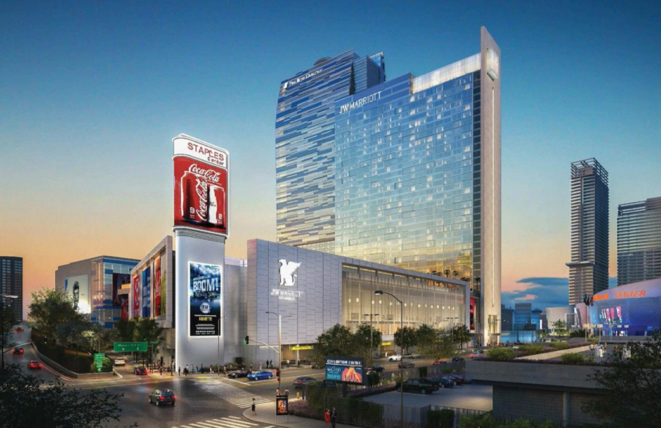 The City of Los Angeles, California Planning Commission has given the go-ahead to a more than $1 billion project which will simultaneously expand the Los Angeles Convention Center and adjoining J.W. Marriott hotel complex. The plan, which is being carried out through a public-private partnership between the City of Los Angeles, AEG, and Plenary Group, calls for the construction of a 37-story tower above an existing parking garage at Chick Hearn Court and Georgia Street featuring a total of 861 hotel guest rooms and a conference center with 228,000 square feet of meeting rooms, multipurpose space, and other functions. The Gensler-designed tower would rise approximately 450 feet in height, and include a large amenity deck facing the western property line. The existing garage, converted into a podium for the hotel, would be wrapped with more than 20,000 square feet of signage. Combined with the existing J.W. Marriott and Ritz Carlton hotel, which features just over 1,000 guest rooms, the expanded project would be the second largest hotel in California if built today.