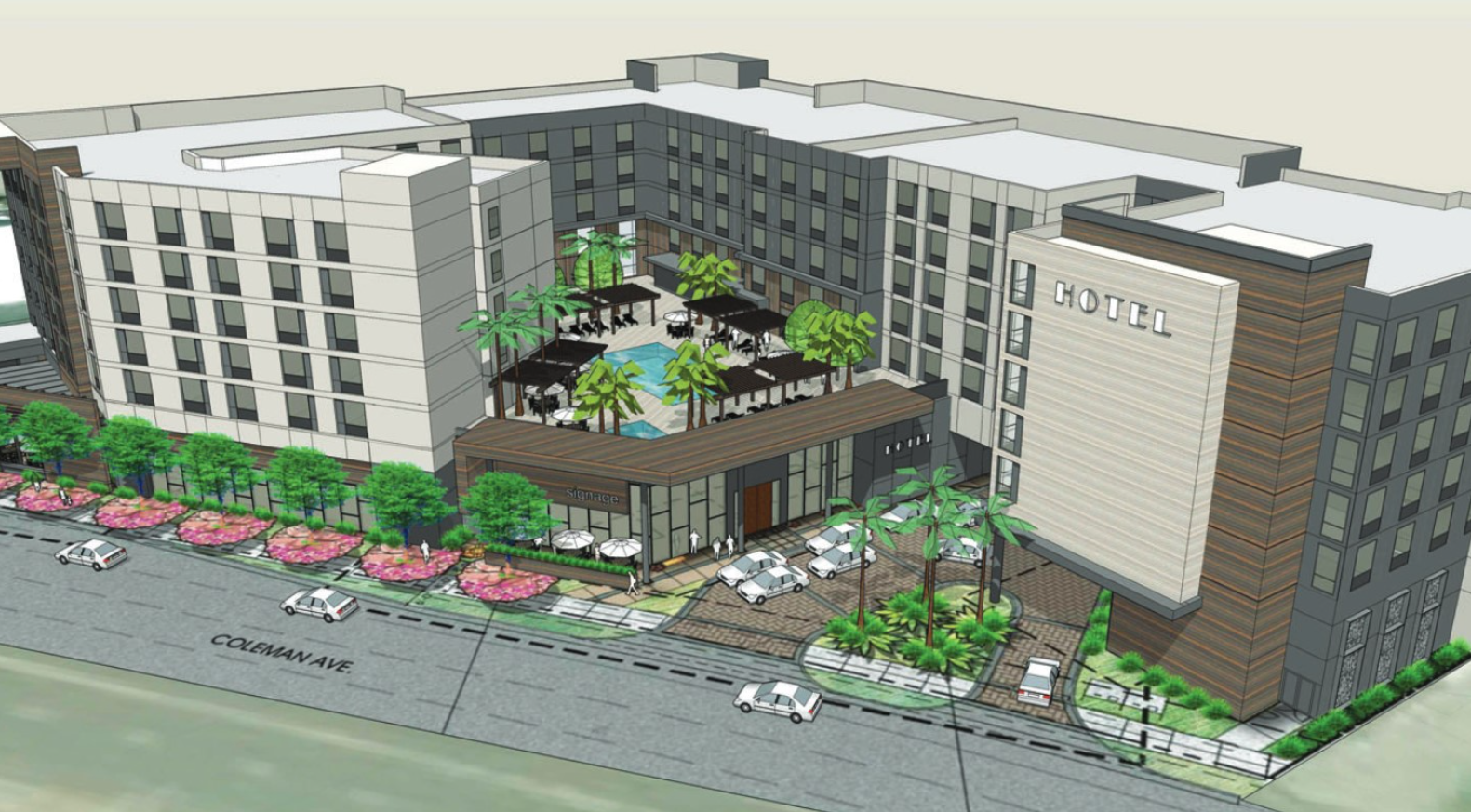 The Santa Clara California Planning Commission has recommended that the City Council approve plans for a 396-room hotel on the intersection of Coleman Avenue and Brokaw Road. The hotel will be a combination of extended stay and limited-service hotel rooms. It will have a bar and restaurant with live, indoor music. Parking at the site will include several EV charging stations. It will be valet only with mechanical lift spaces. The development will mean the demolition of two long time properties in Santa Clara that were most recently occupied by Lillie Mae’s House of Soul Food and the Old Coleman Still. The project is being developed by: Kevin Wennergren/Rachel Lambert, Mogul Hospitality Partners, & Santa Clara LLC.