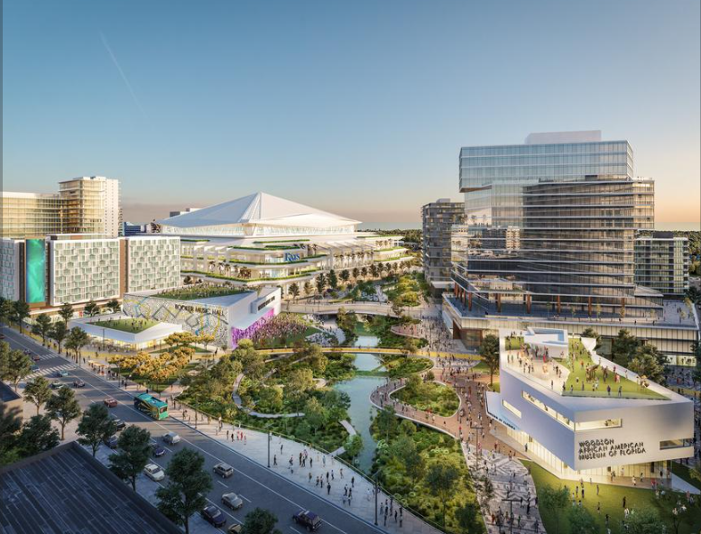 The Tampa Bay Rays and Hines Development are planning an 86-acre mixed use project at the Historic Gas Plant District in downtown St Petersburg, Florida. The proposed 7 million square foot redevelopment will include a new baseball park for the Tampa Bay Rays, 5,700 multifamily units, 1.4 million square feet of office, 300,000 square feet of retail, a 2,500-person entertainment venue, 700 hotel rooms and 600 senior living residences. The team is also planning to build a music hall on the property, and renderings show plans to relocate the Dr. Carter G. Woodson African American Museum to the site. The project would begin in late 2024 and be complete by the start of baseball season in 2028.